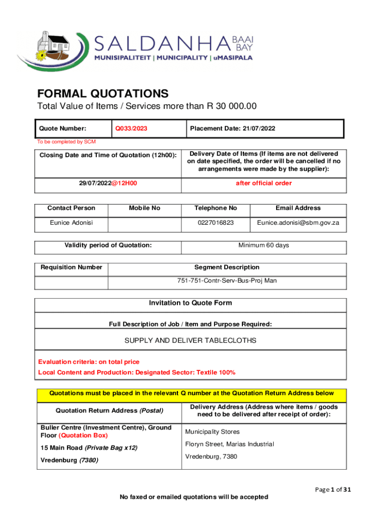FORMAL QUOTATIONS Total Value of Items / Services more than R 30 000.00 Quote Number:Q033/2023Placement Date: 21/07/2022To be completed by Closing Date and Time of Quotation (12h00):Delivery Date