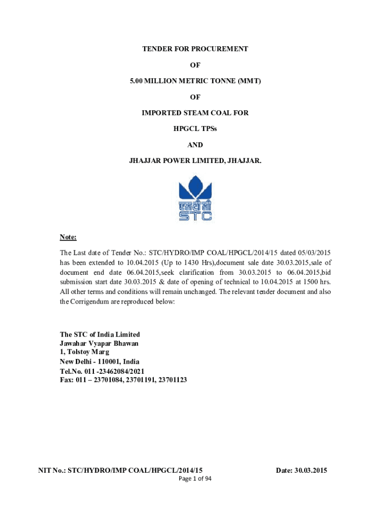 TENDER FOR PROCUREMENT OF 5.00 MILLION METRIC TONNE (MMT) OF IMPORTED STEAM COAL FOR HPGL Toss AND HANGAR POWER LIMITED, HANGAR. Note: The Last date of Tender No.: STC/HYDRO/IMP COAL/HPGL/2014/15