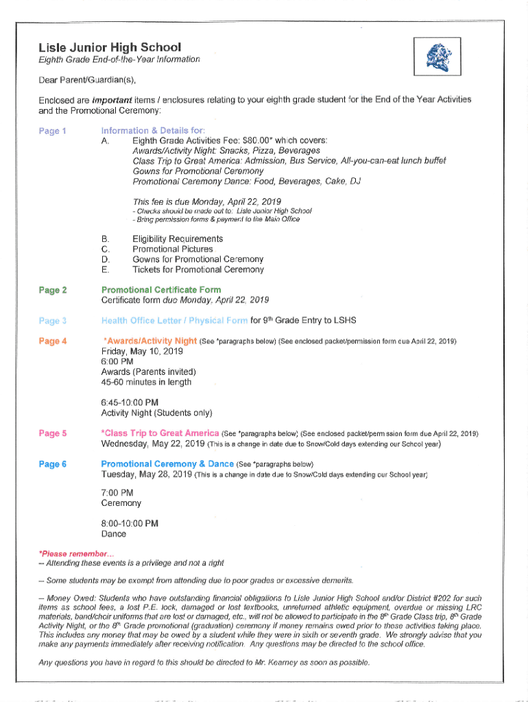 EighthG&rade EndoftheYear I nformationDear ParenVGuardian(s), Enclosed are important items / enclosures relating to your eighth grade student for the End of the Year Activities