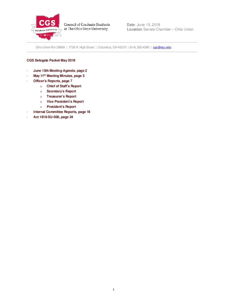 Date: June 15, 2018, Location Senate Chamber Ohio Union Rm 2088A | 1739 N. High Street | Columbus, OH 43210 | (614) 2924380 | cgs@osu.eduCGS Delegate Packet May 2018 June 15th Meeting Agenda, page