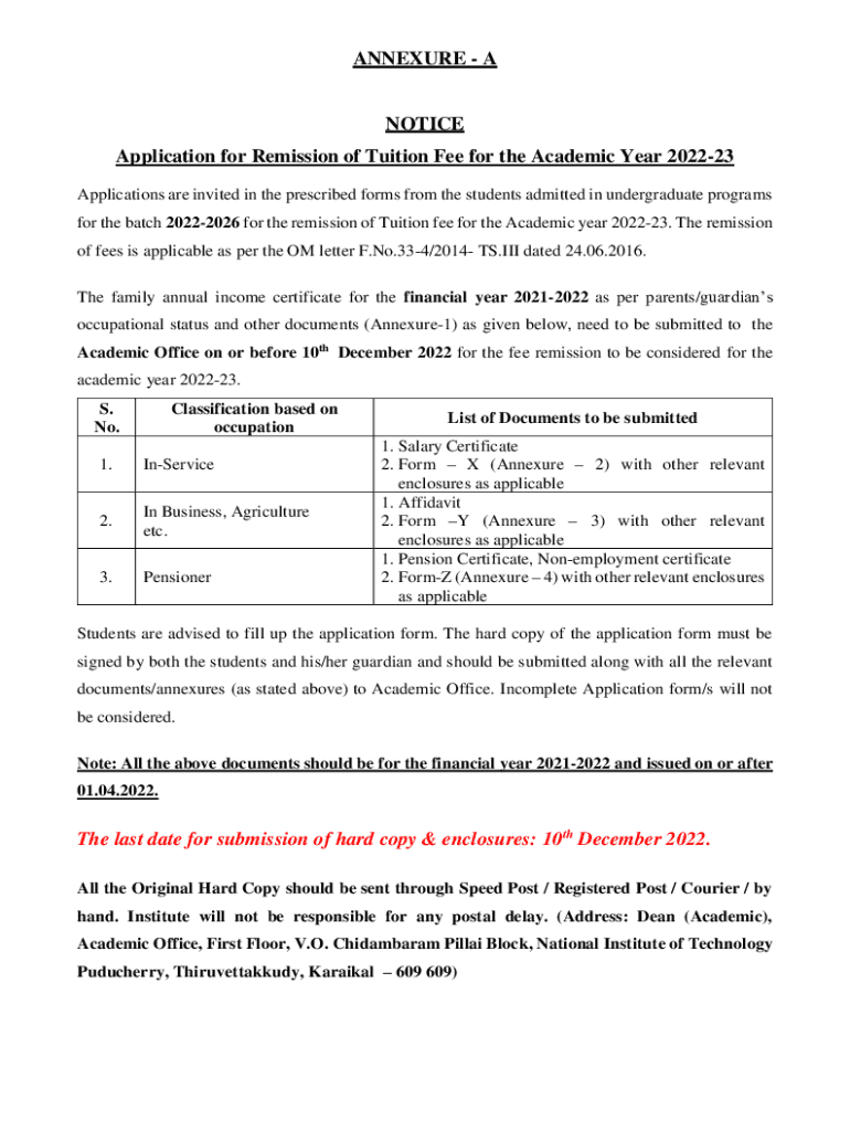 Appendix NOTICE Application for Remission of Tuition Fee for the Academic Year 202223 Applications are invited in the prescribed forms from the students admitted in undergraduate programs for the