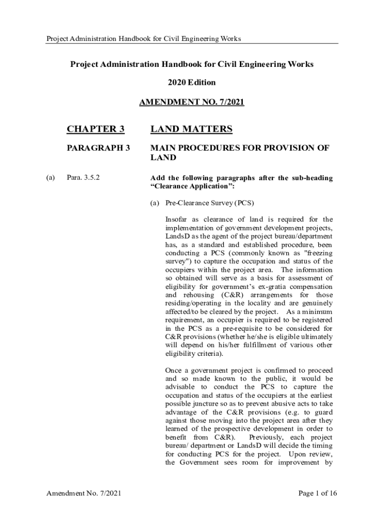 Project Administration Handbook for Civil Engineering WorksProject Administration Handbook for Civil Engineering Works 2020 Edition AMENDMENT NO. 7/2021(a)CHAPTER 3LAND MATTERSPARAGRAPH 3MAIN PROCEDURES