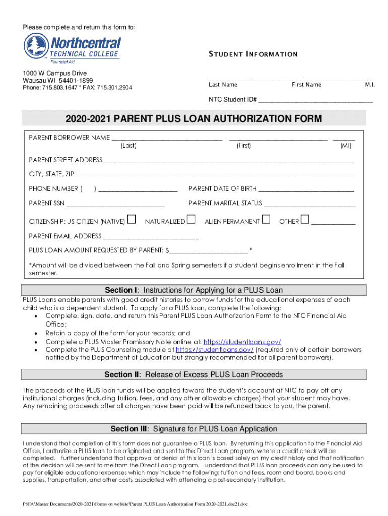 Please complete and return this form to's TU D E NT I N F OR M AT IO N 1000 W Campus Drive Wausau WI 544011899___ Last Telephone: 715.803.1647 * FAX: 715.301.2904First Name. I.NTC Student ID# ___20202021
