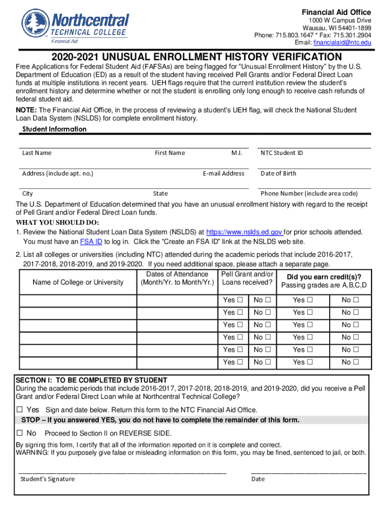 Financial Aid Office 1000 W Campus Drive Wausau, WI 544011899 Phone: 715.803.1647 * Fax: 715.301.2904 Email: financialaid@ntc.edu20202021 UNUSUAL ENROLLMENT HISTORY VERIFICATION Free Applications