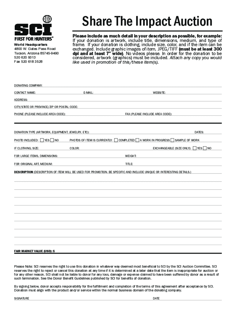 Share The Impact Auction World Headquarters 4800 W. Gates Pass Road Tucson, Arizona 857459490 520 620 9313 Fax 520 618 3528Please include as much detail in your description as possible, for example: