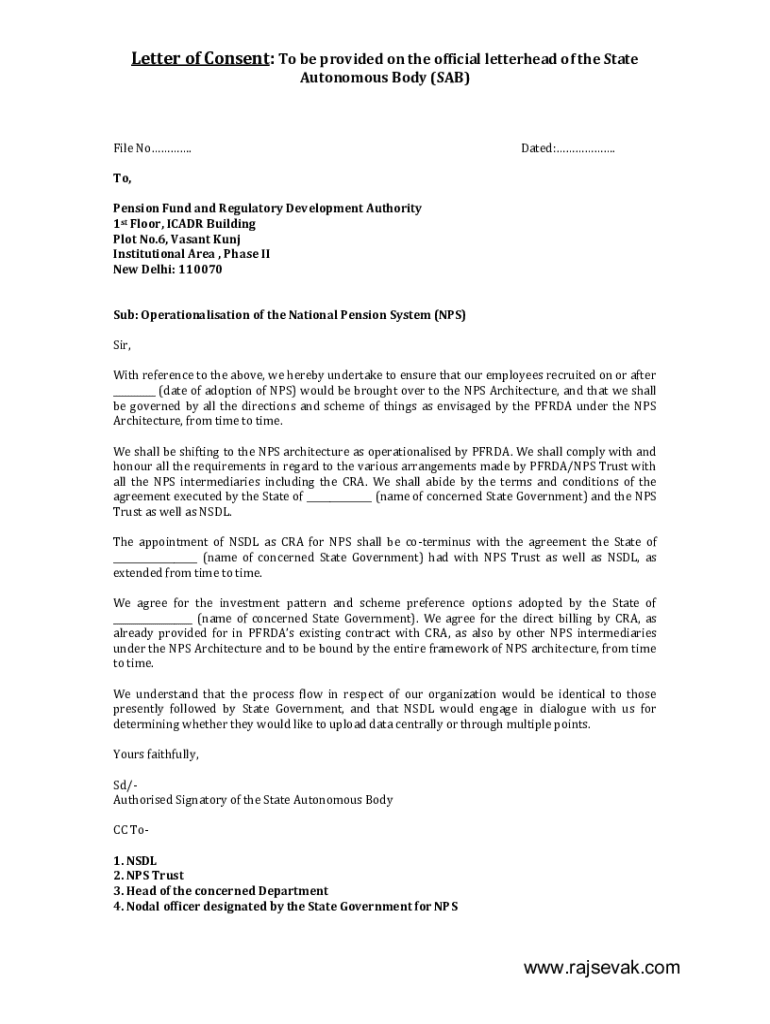 Letter of Consent: To be provided on the official letterhead of the State Autonomous Body (SAB)File No. Dated:. To, Pension Fund and Regulatory Development Authority 1st Floor, ICA DR Building Plot