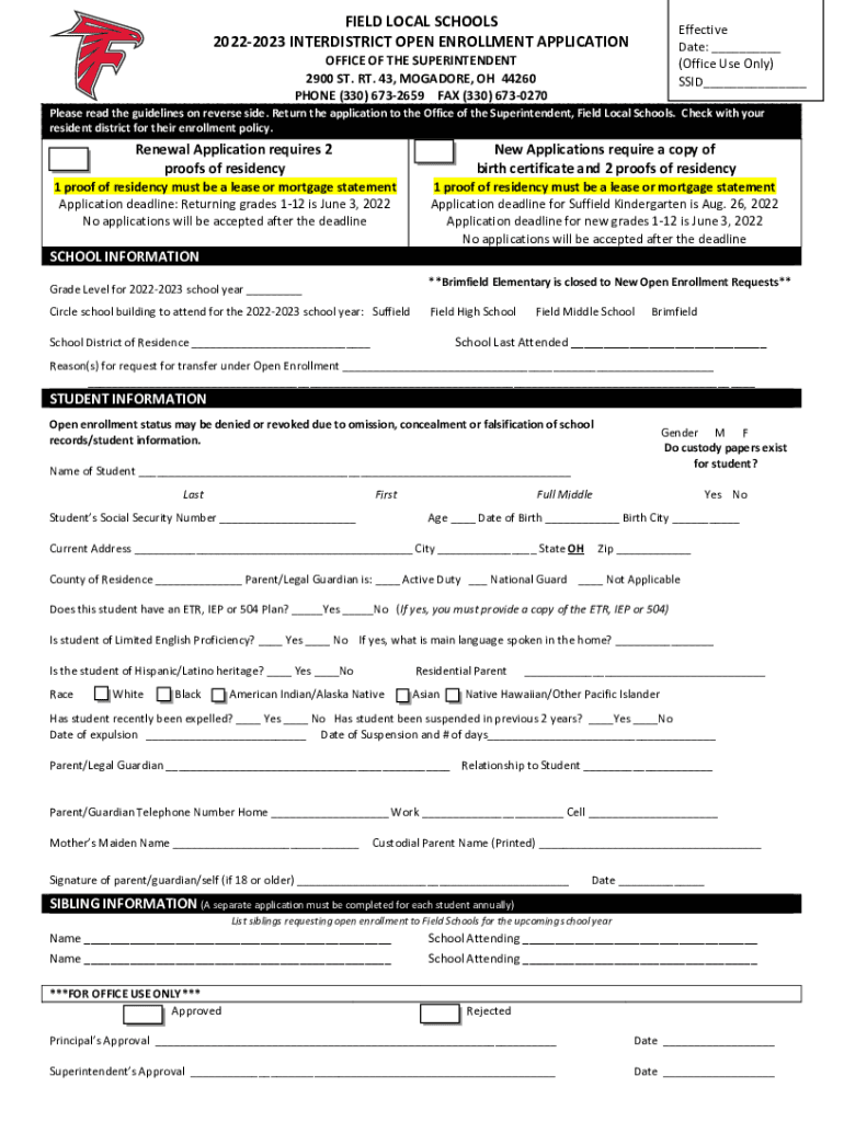 FIELD LOCAL SCHOOLS 20222023 INTERDISTRICT OPEN ENROLLMENT APPLICATIONEffective Date: ___ (Office Use Only) SSID___OFFICE OF THE SUPERINTENDENT 2900 ST. RT. 43, MEGADOSE, OH 44260 PHONE (330) 6732659