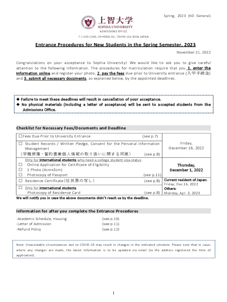 Spring, 2023 (ND General)ADMISSIONS OFFICE 71 JERICHO, CHIYODAKU, TOKYO 1028554 JAPANEntrance Procedures for New Students in the Spring Semester, 2023 November 21, 2022Congratulations on your acceptance