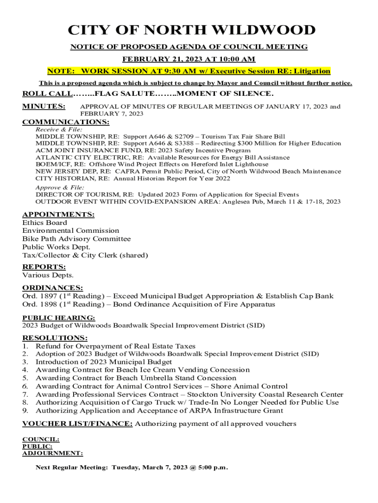 CITY OF NORTH WILDWOOD NOTICE OF PROPOSED AGENDA OF COUNCIL MEETING FEBRUARY 21, 2023, AT 10:00 AM NOTE: WORK SESSION AT 9:30 AM w/ Executive Session RE: Litigation This is a proposed agenda which