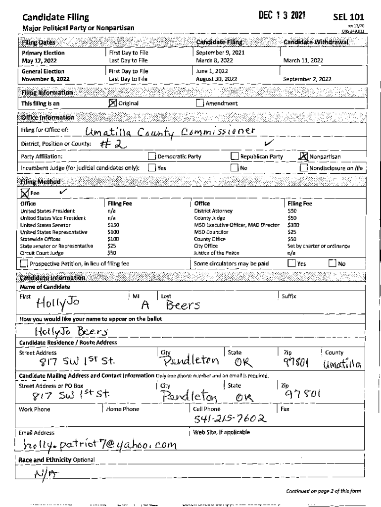 DEC 1 3 2021Candidate Filing SEL 101 rev 12/20 ORS 249.031Major Political Party or NonpartisanPrimary Election May 17, 2022First Day to File Last Day to FileGeneral Election November 8, 2022September