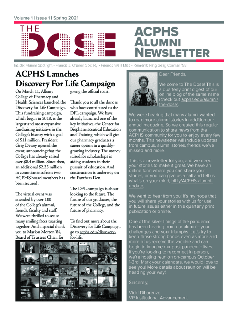 Volume 1 | Issue 1 | Spring 2021ACPHS Alumni NewsletterInside: Alumni Spotlight Francis J. O'Brien Society Friends Well Miss Remembering Selim Norman 58ACPHS Launches Discovery For Life Campaign On