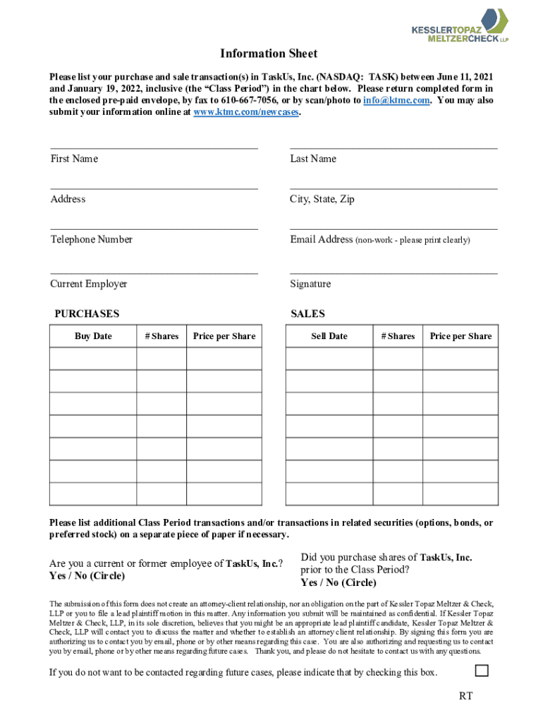 Information Sheet Please list your purchase and sale transaction(s) in Tasks, Inc. (NASDAQ: TASK) between June 11, 2021, and January 19, 2022, inclusive (the Class Period) in the chart below. Please