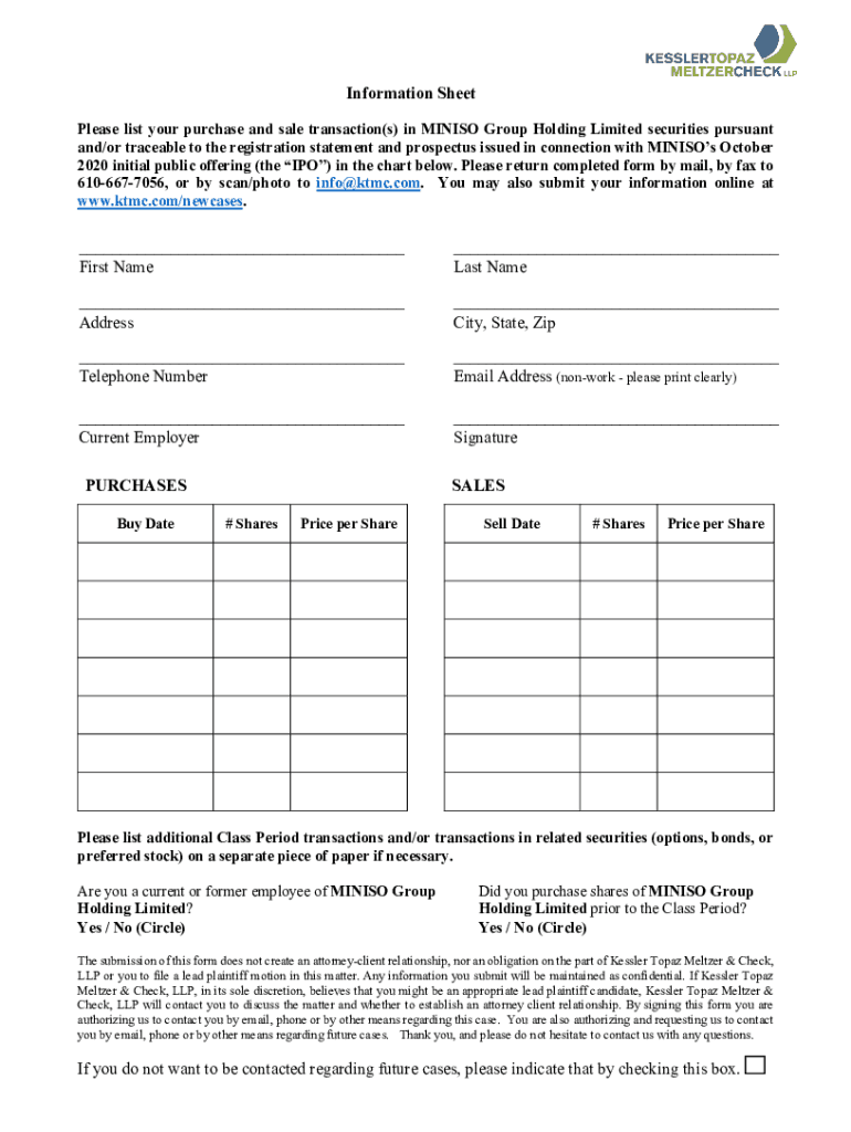 Information Sheet Please list your purchase and sale transaction(s) in MINIS Group Holding Limited securities pursuant and/or traceable to the registration statement and prospectus issued in connection