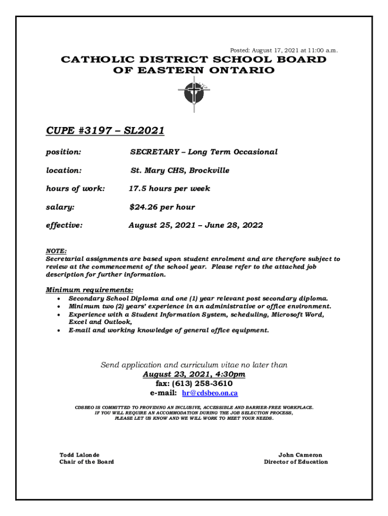 Posted: August 17, 2021, at 11:00 a.m.CATHOLIC DISTRICT SCHOOL BOARD OF EASTERN ONTARIOCUPE #3197 SL2021 position:SECRETARY Long Term Occasion allocation:St. Mary CHS, Brockvillehours of work:17.5
