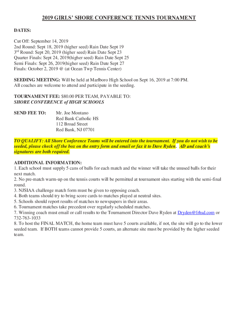 2019 GIRLS SHORE CONFERENCE TENNIS TOURNAMENT DATES: Cut Off: September 14, 2019 2nd Round: Sept 18, 2019 (higher seed) Rain Date Sept 19 3rd Round: Sept 20, 2019 (higher seed) Rain Date Sept 23 Quarter