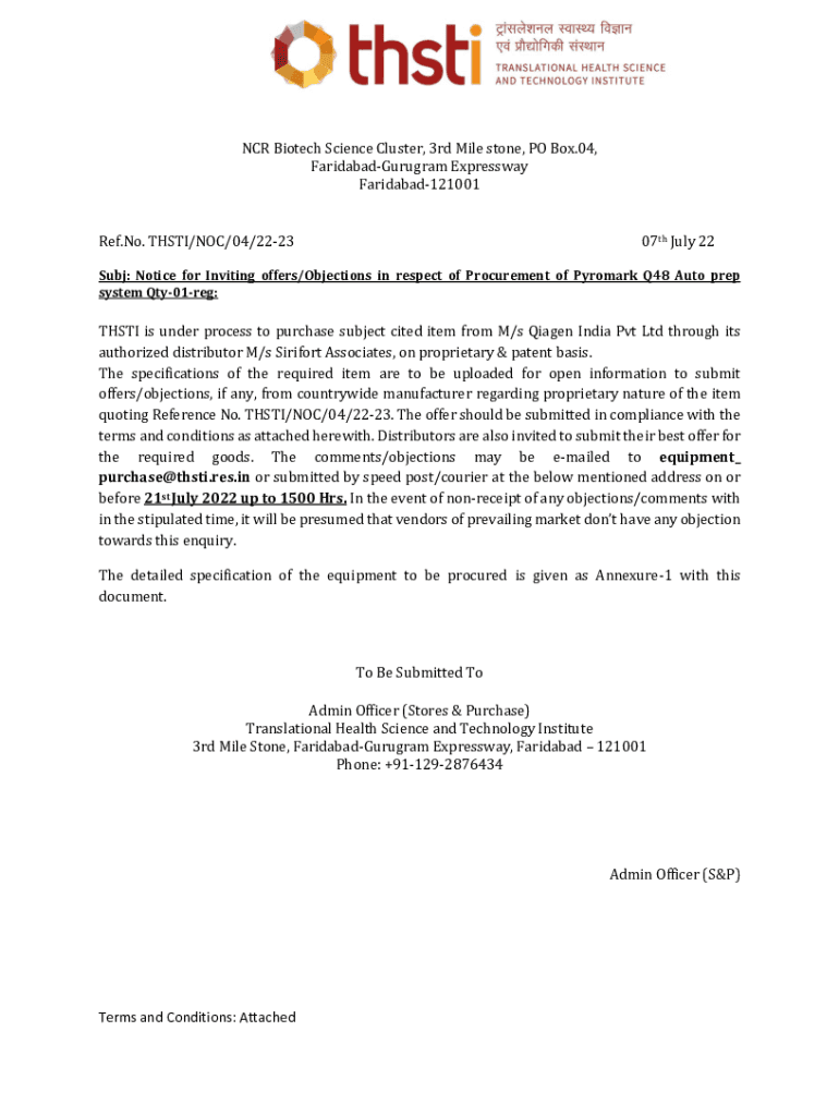 NCR Biotech Science Cluster, 3rd Mile stone, PO Box.04, FaridabadGurugram Expressway Faridabad121001 Ref.No. TH STI/NOC/04/222307th July 22Subj: Notice for Inviting offers/Objections in respect of