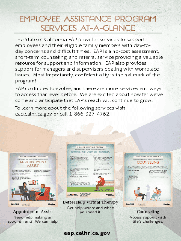 Employee Assistance Program Services Balance The State of California EAP provides services to support employees and their eligible family members with day today concerns and difficult times. EAP is