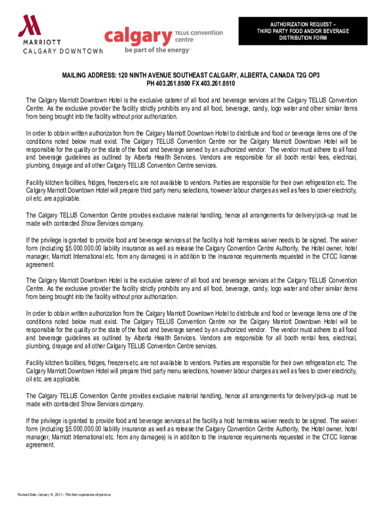 AUTHORIZATION REQUEST THIRD PARTY FOOD AND/OR BEVERAGE DISTRIBUTION FORMATTING ADDRESS: 120 NINTH AVENUE SOUTHEAST CALGARY, ALBERTA, CANADA T2G OP3 PH 403.261.8500 FX 403.261.8510 The Calgary Marriott