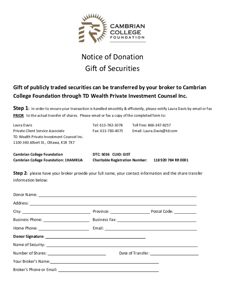 Notice of Donation Gift of Securities Gift of publicly traded securities can be transferred by your broker to Cambrian College Foundation through TD Wealth Private Investment Counsel Inc. Step 1:In