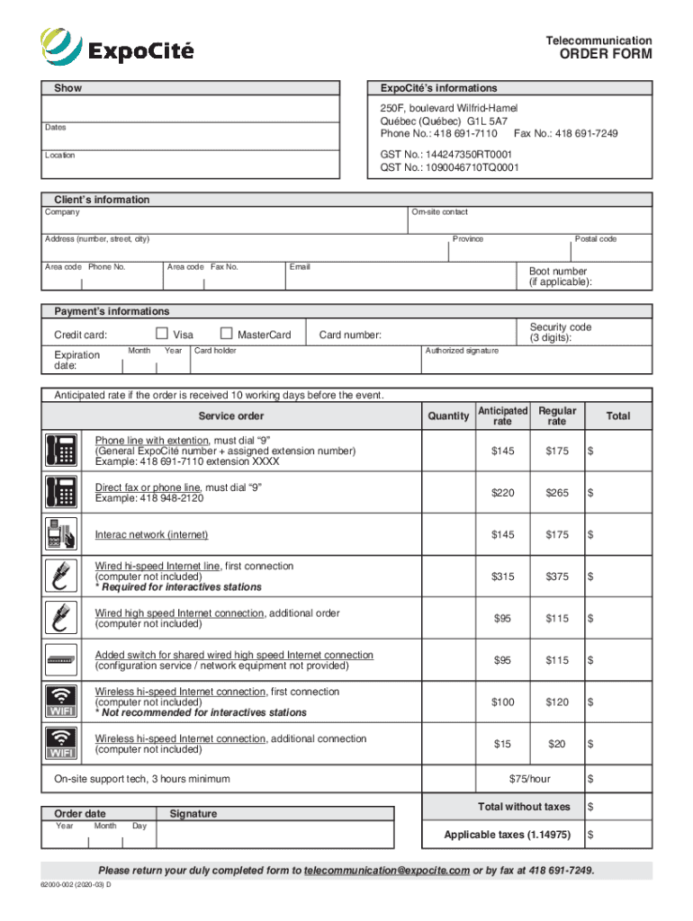 TelecommunicationORDER FORMShowExpoCits information 250F, boulevard WilfridHamel Quebec (Quebec) G1L 5A7 Phone No.: 418 6917110 Fax No.: 418 6917249DatesGST No.: 144247350RT0001 ST No.: 1090046710TQ0001LocationClients