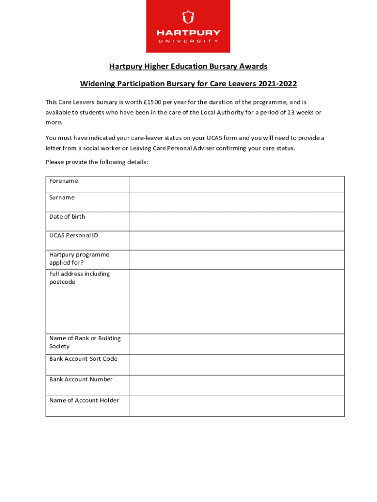 Arthur Higher Education Bursary Awards Widening Participation Bursary for Care Leavers 20212022 This Care Leavers bursary is worth 1500 per year for the duration of the program, and is available to