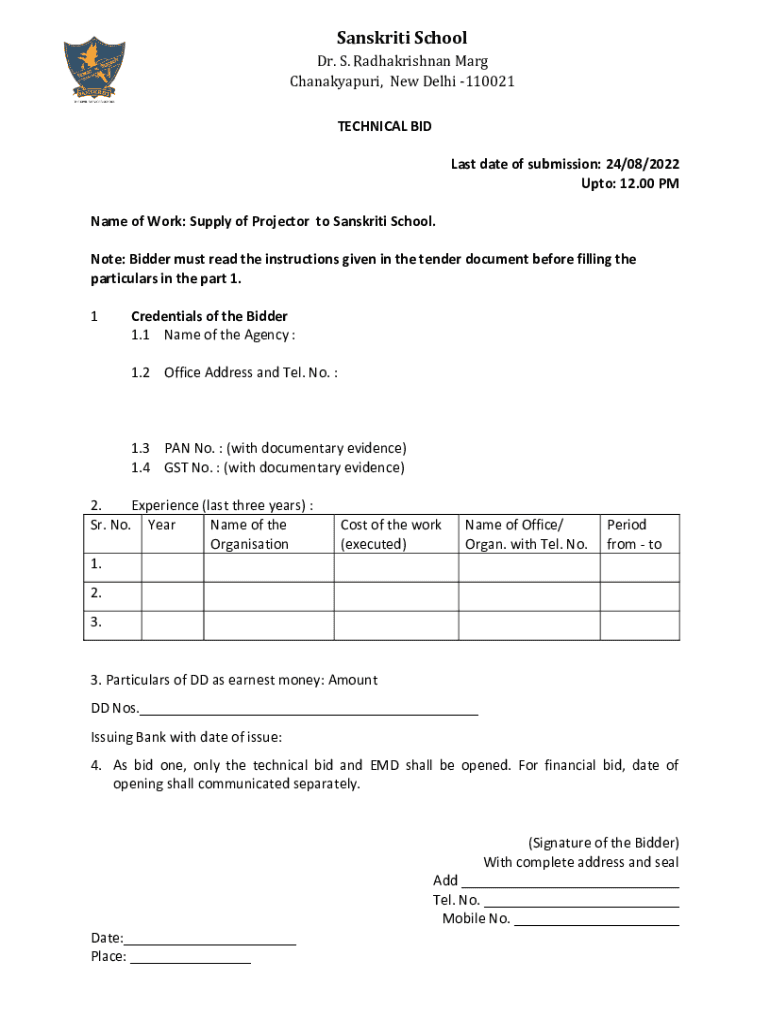 Sanskrit School Dr. S. Radhakrishnan Mary Chanakyapuri, New Delhi 110021 TECHNICAL BID Last date of submission: 24/08/2022 Unto: 12.00 PM Name of Work: Supply of Projector to Sanskrit School. Note: