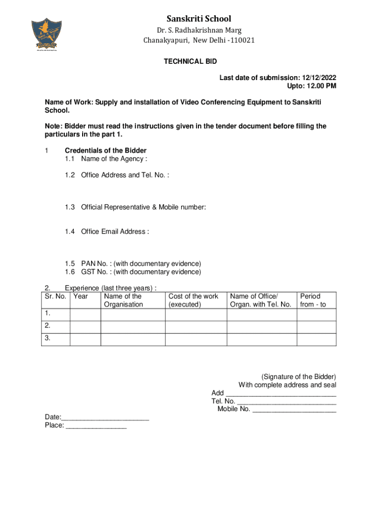 Sanskrit School Dr. S. Radhakrishnan Mary Chanakyapuri, New Delhi 110021 TECHNICAL BID Last date of submission: 12/12/2022 Unto: 12.00 PM Name of Work: Supply and installation of Video Conferencing