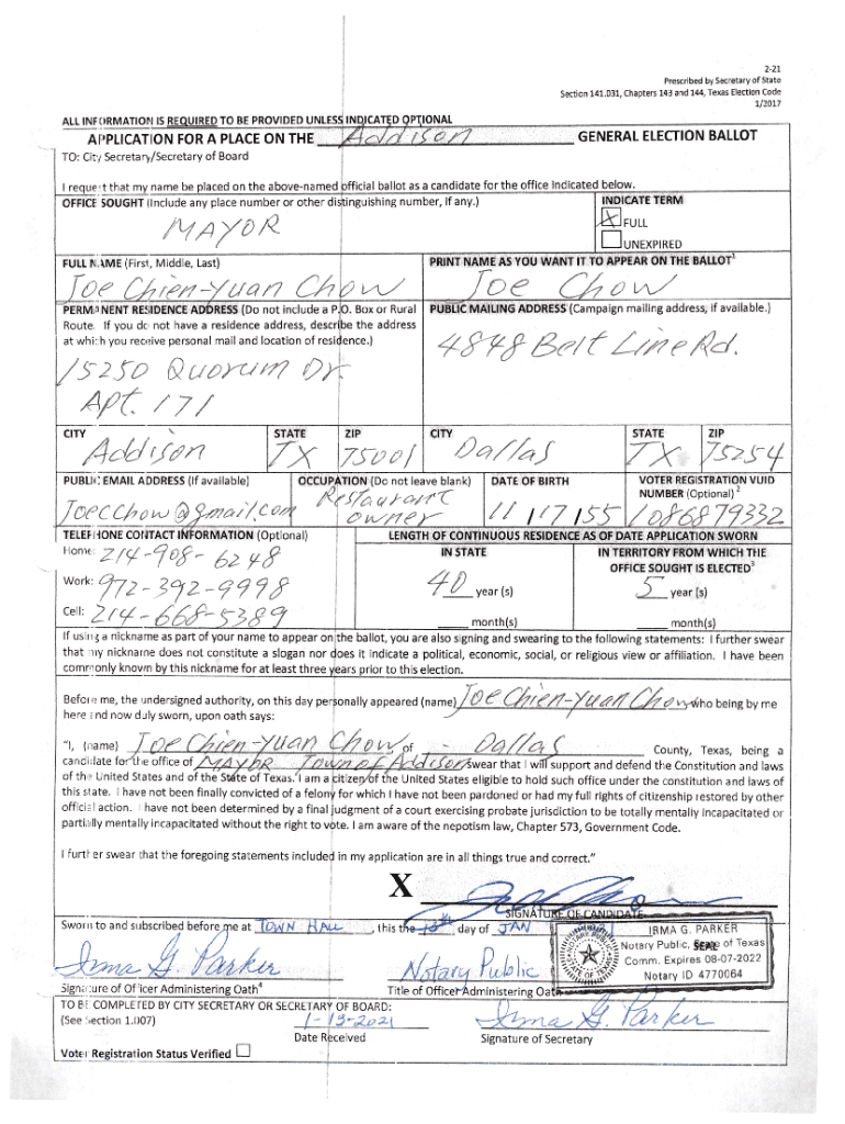 2 21Prescribed by Secretary of State Section 141. 031, Chapters143 and 144, Texas ElectionCode1/ 2017ALL INFORMATION IS REQUIRED TO BE PROVIDED UNLESS IND CAT5D PT, TONAL ON There A PLACEAPPLICATION\'VIIsGENERALf