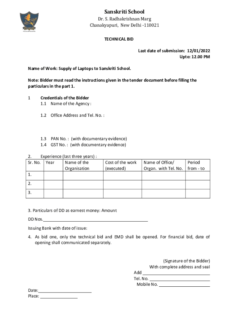 Sanskrit School Dr. S. Radhakrishnan Mary Chanakyapuri, New Delhi 110021 TECHNICAL BID Last date of submission: 12/01/2022 Unto: 12.00 PM Name of Work: Supply of Laptops to Sanskrit School. Note: