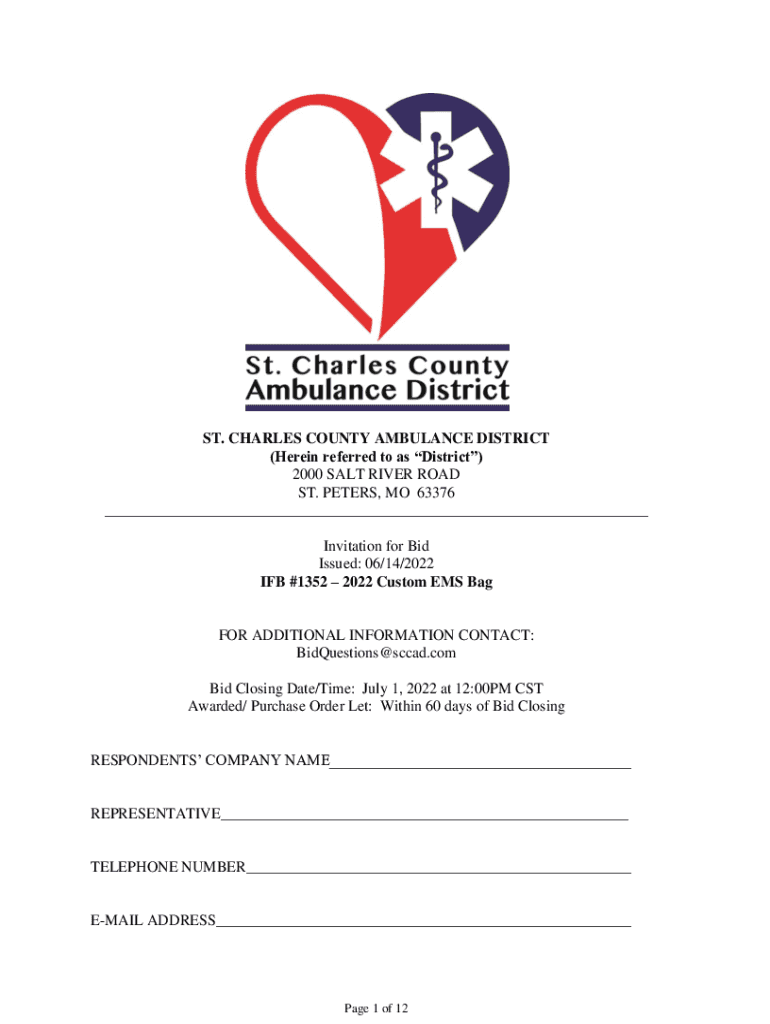 ST. CHARLES COUNTY AMBULANCE DISTRICT (Herein referred to as District) 2000 SALT RIVER ROAD ST. PETERS, MO 63376 ___ Invitation for Bid Issued: 06/14/2022 IF #1352 2022 Custom EMS Bangor ADDITIONAL