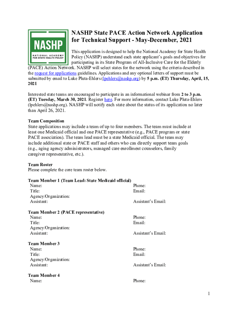 NASH State PACE Action Network Application for Technical Support May December 2021 This application is designed to help the National Academy for State Health Policy (NASH) understand each state applicants
