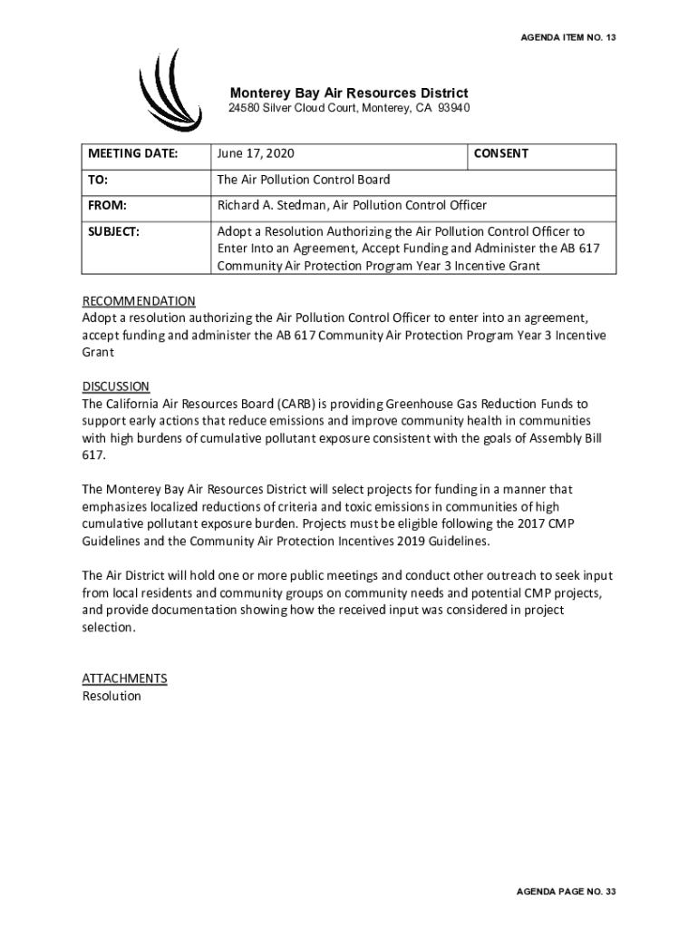 AGENDA ITEM NO. 13Monterey Bay Air Resources District24580 Silver Cloud Court, Monterey, CA 93940MEETING DATE:June 17, 2020CONSENTTO:The Air Pollution Control Boardroom:Richard A. Sherman, Air Pollution