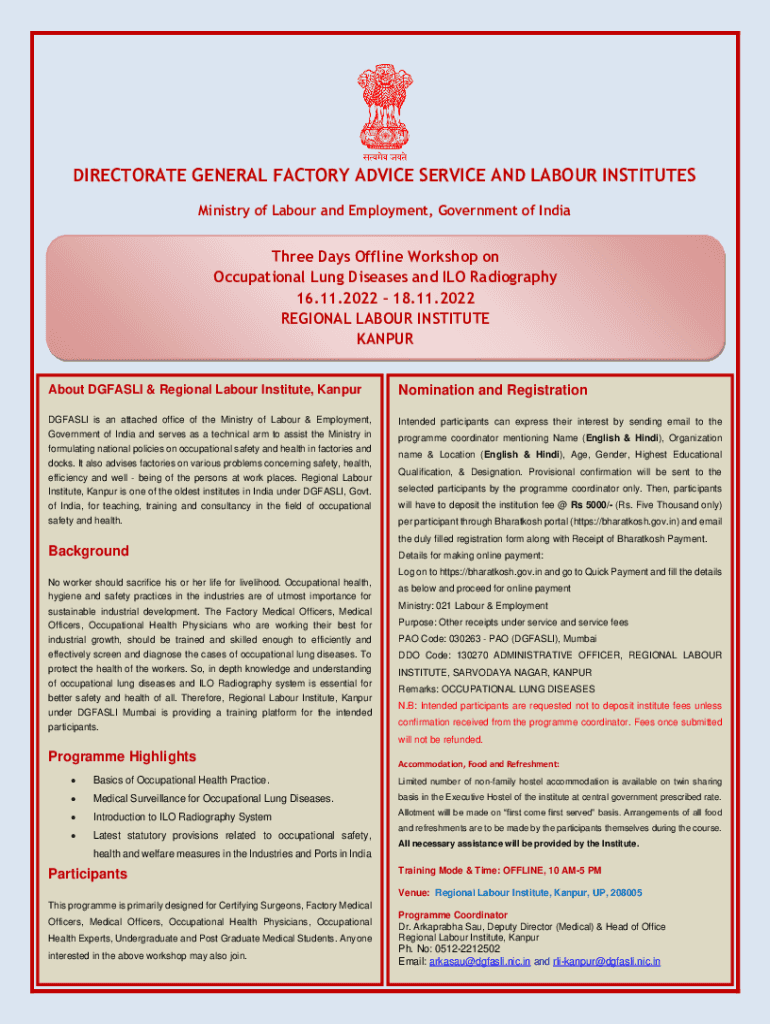 DIRECTORATE GENERAL FACTORY ADVICE SERVICE AND Labor INSTITUTES Ministry of Labor and Employment, Government of IndiaThree Days Offline Workshop on Occupational Lung Diseases and ILL Radiography 16.11.2022