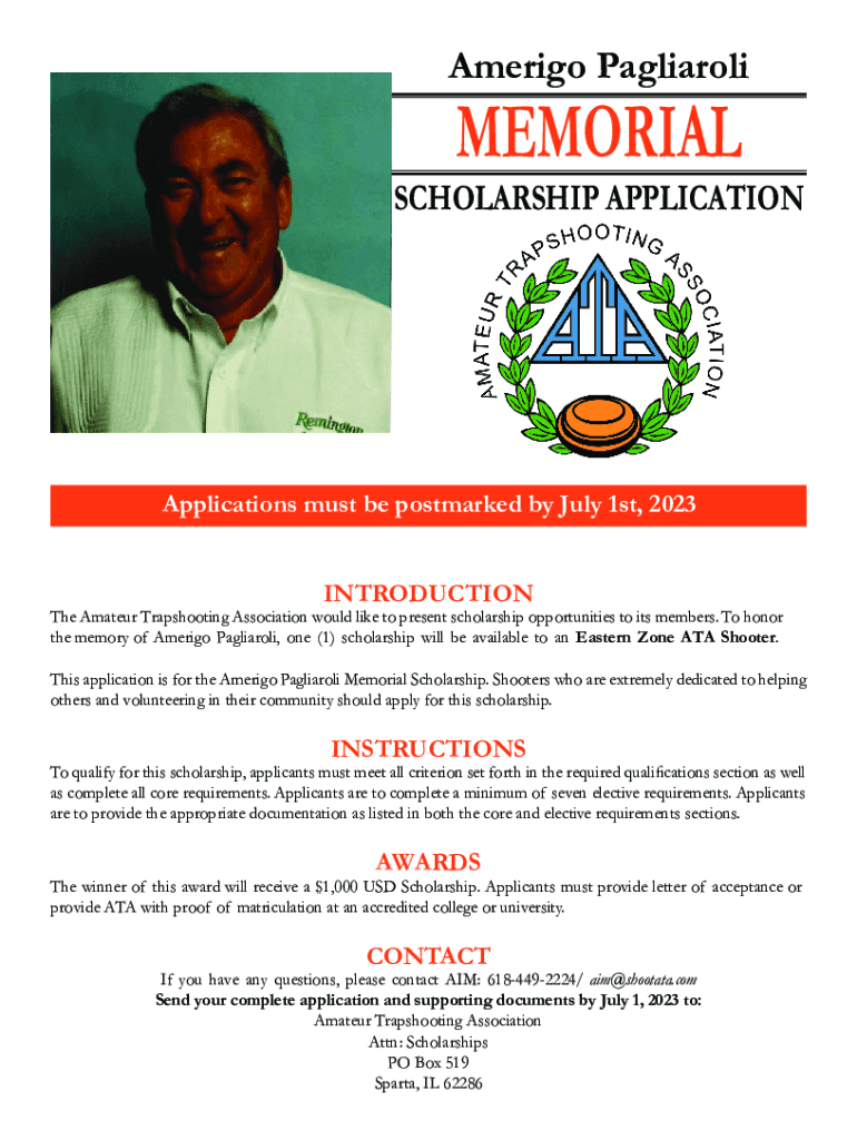 Amerigo PagliaroliMEMORIALSCHOLARSHIP APPLICATIONApplications must be postmarked by July 1st, 2023 Introduction Amateur Trapshooting Association would like to present scholarship opportunities to