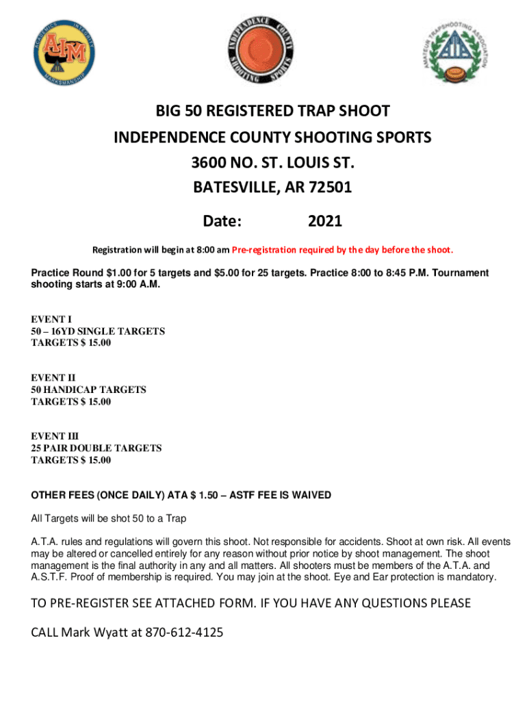 BIG 50 REGISTERED TRAP SHOOT INDEPENDENCE COUNTY SHOOTING SPORTS 3600 NO. ST. LOUIS ST. BATESVILLE, AR 72501 Date:2021Registration will begin at 8:00 am Preregistration required by the day before