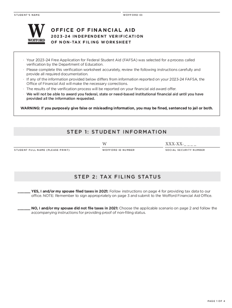 STUDENTS NAME F O R D I D :OFFICE OF FINANCIAL AID 2 0 2 3 2 4 I N D E P E N D E N T V E R I F I C AT I O N O F N O N TA X F I L I N G TO R K S H ET Your 202324 Free Application for Federal Student