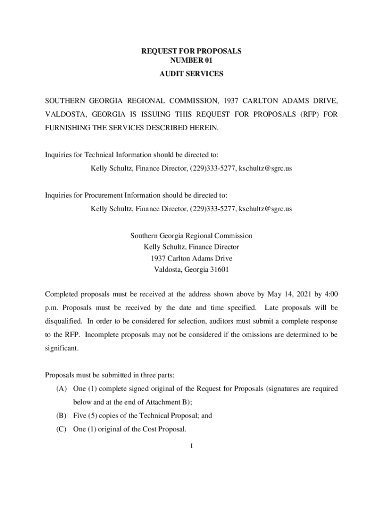 REQUEST FOR PROPOSALS NUMBER 01 AUDIT SERVICESSOUTHERN GEORGIA REGIONAL COMMISSION, 1937 CARLTON ADAMS DRIVE, VALDOSTA, GEORGIA IS ISSUING THIS REQUEST FOR PROPOSALS (RFP) FOR FURNISHING THE SERVICES