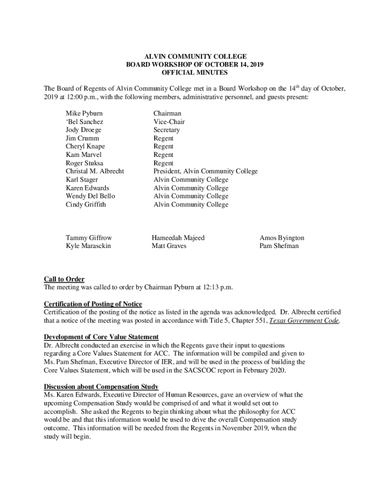 OFFICIAL MINUTEST he Boards of Regents of Alvin Community College met in a Board Workshop on the 14th day of October 2019 at 12:00 p.m.,
