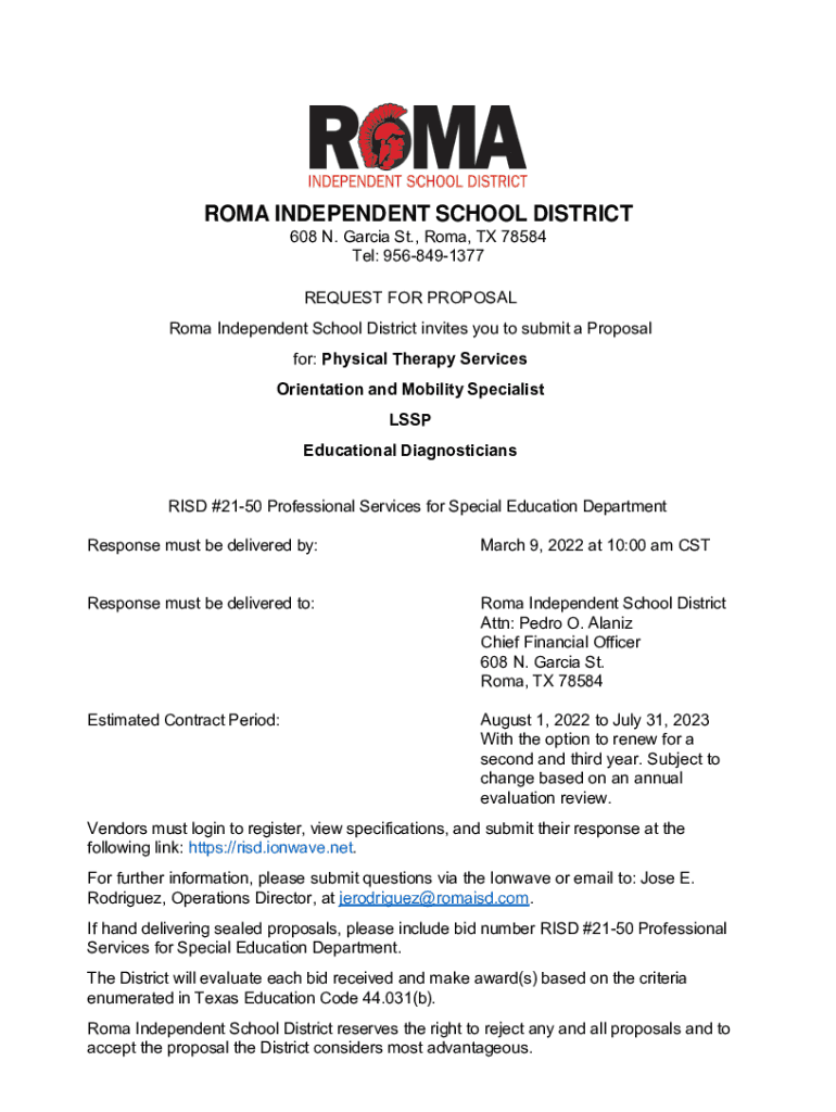 ROMA INDEPENDENT SCHOOL DISTRICT 608 N. Garcia St., Roma, TX 78584 Tel: 9568491377 REQUEST FOR PROPOSAL Roma Independent School District invites you to submit a Proposal for: Physical Therapy Services