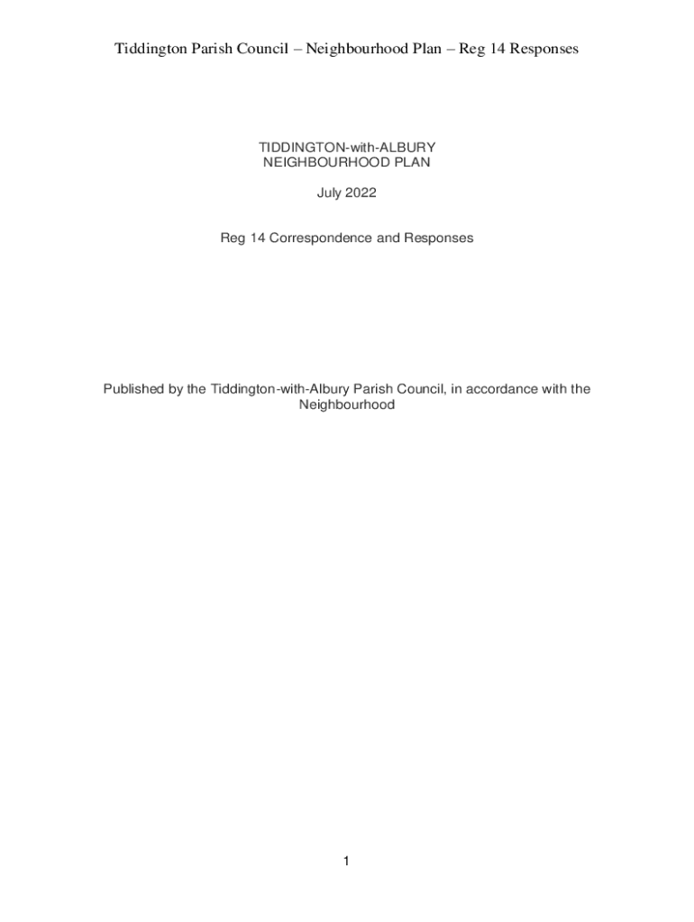 Eddington Parish Council Neighborhood Plan Reg 14 ResponsesTIDDINGTONwithALBURY Neighborhood PLAN July 2022Reg 14 Correspondence and ResponsesPublished by the TiddingtonwithAlbury Parish Council,