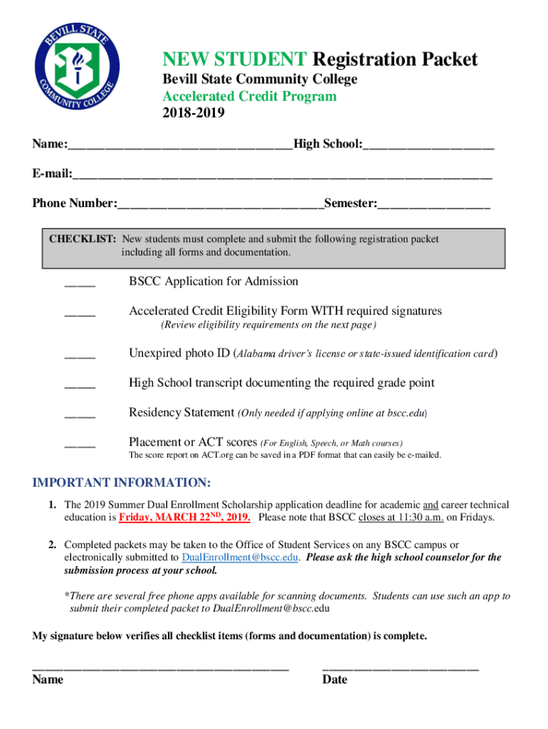 NEW STUDENT Registration Packet Bill State Community College Accelerated Credit Program 20182019 Name:___High School:___ Email:___ Phone Number:___Semester:___ CHECKLIST: New students must complete