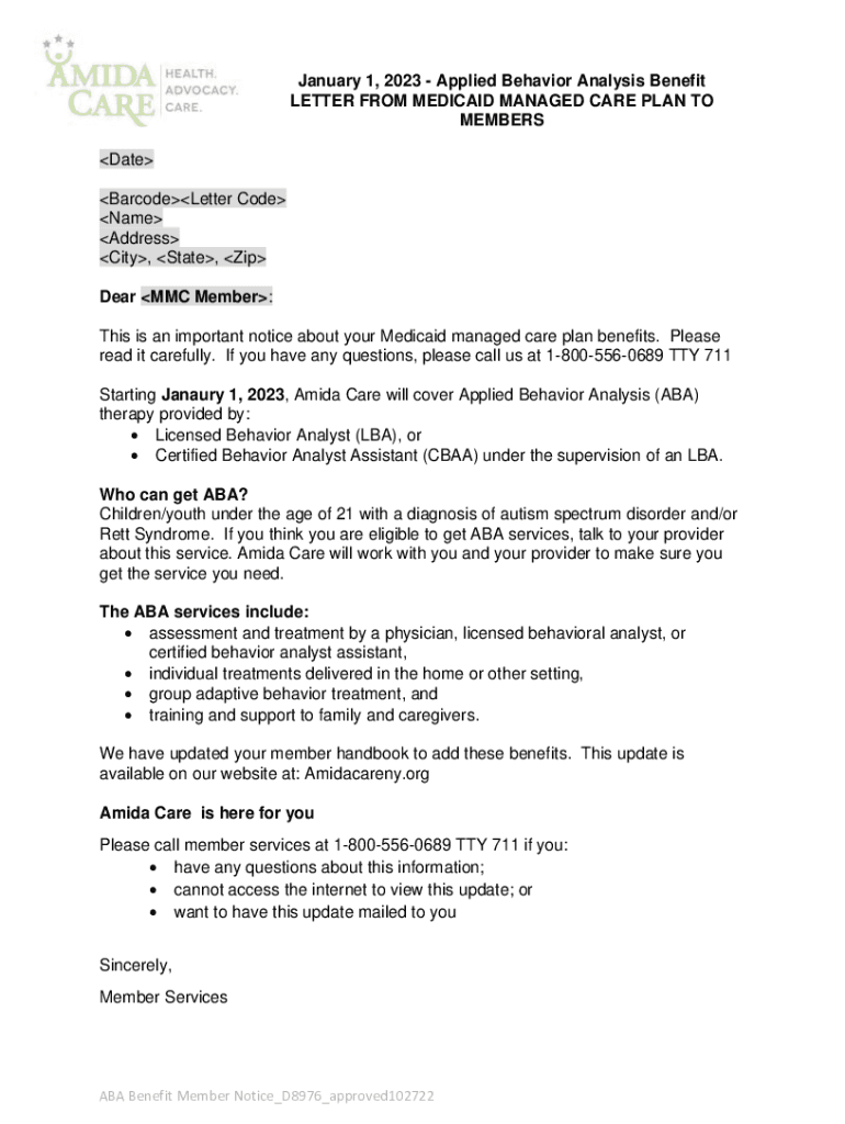 January 1, 2023, Applied Behavior Analysis Benefit LETTER FROM MEDICAID MANAGED CARE PLAN TO MEMBERS Date BarcodeLetter Code Name Address City, State, Zip Dear MMC Member: This is an important notice