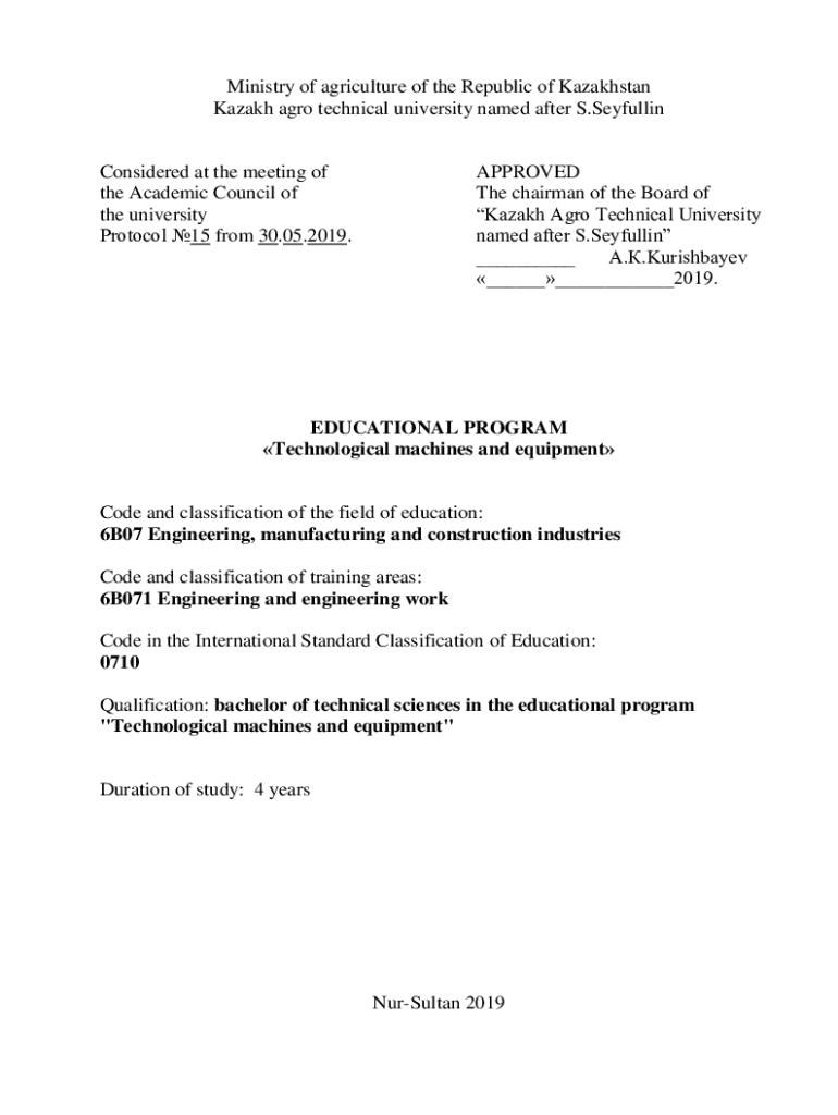 Ministry of agriculture of the Republic of Kazakhstan Kazakh ago technical university named after S. SeyfullinConsidered at the meeting of the Academic Council of the university Protocol 15 from 30.05.2019.APPROVED