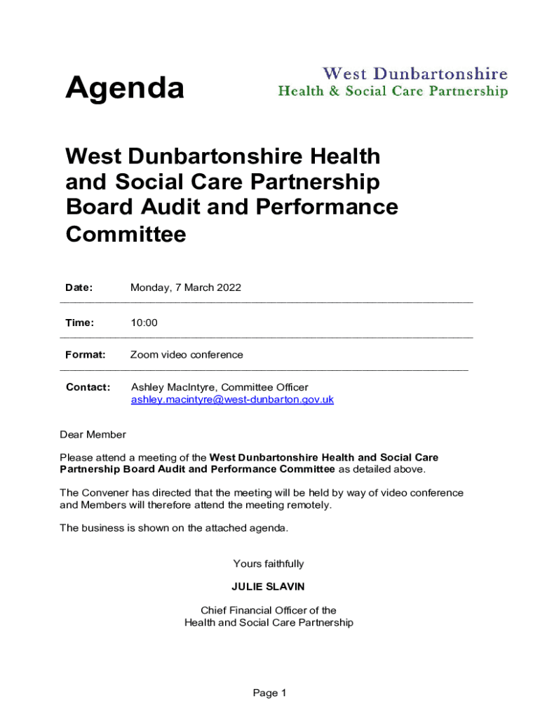Agenda West Dunbartonshire Health and Social Care Partnership Board Audit and Performance Committee Date:Monday, 7 March 2022Time:10:00Format:Zoom video conferenceContact:Ashley MacIntyre, Committee