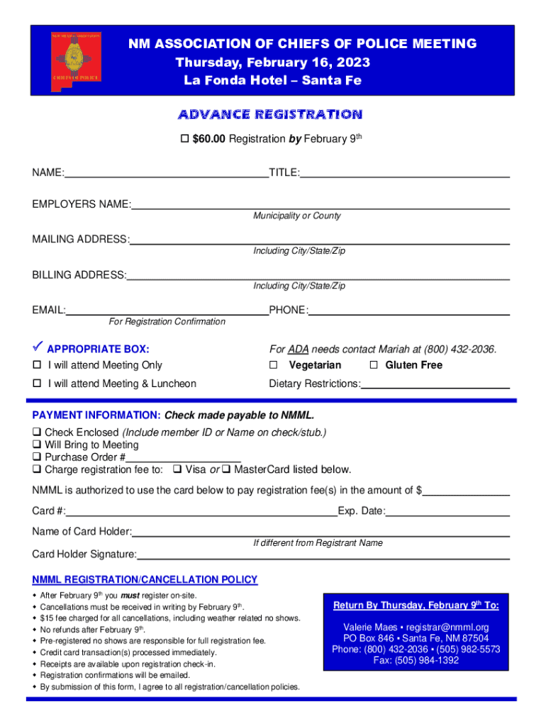 NM ASSOCIATION OF CHIEFS OF POLICE MEETING Thursday, February 16, 2023, La Fonda Hotel Santa Fe ADVANCE REGISTRATION $60.00 Registration by February 9th NAME:TITLE:EMPLOYERS NAME: Municipality or