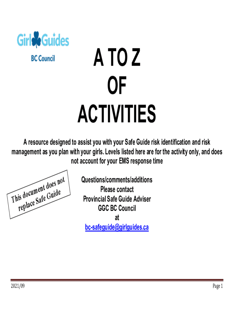 A TO Z OF ACTIVITIES A resource designed to assist you with your Safe Guide risk identification and risk management as you plan with your girls. Levels listed here are for the activity only, and does