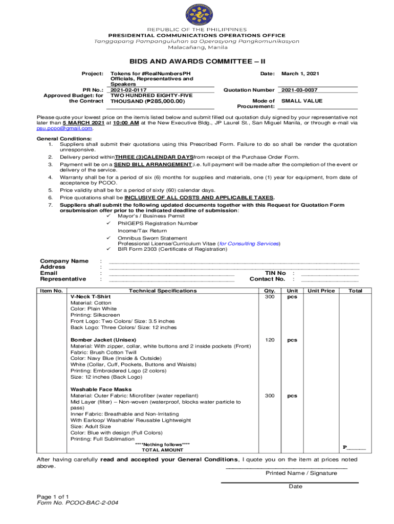 BIDS AND AWARDS COMMITTEE II Project:PR No.: Approved Budget: for the Contractions for #RealNumbersPH Officials, Representatives and Speakers 2021020117 TWO HUNDRED HIGH-FIVE A THOUSAND (285,000.00)Date:Quotation