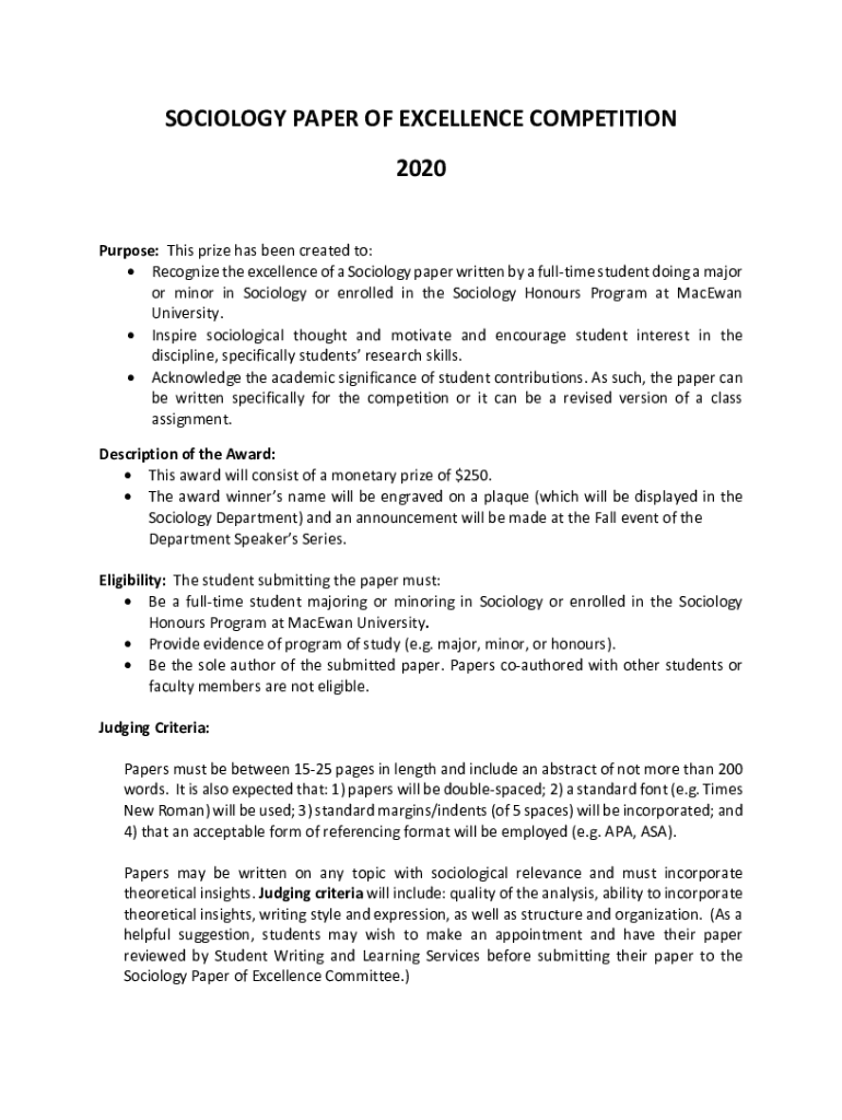 SOCIOLOGY PAPER OF EXCELLENCE COMPETITION 2020 Purpose: This prize has been created to: Recognize the excellence of a Sociology paper written by a full time student doing a major or minor in Sociology