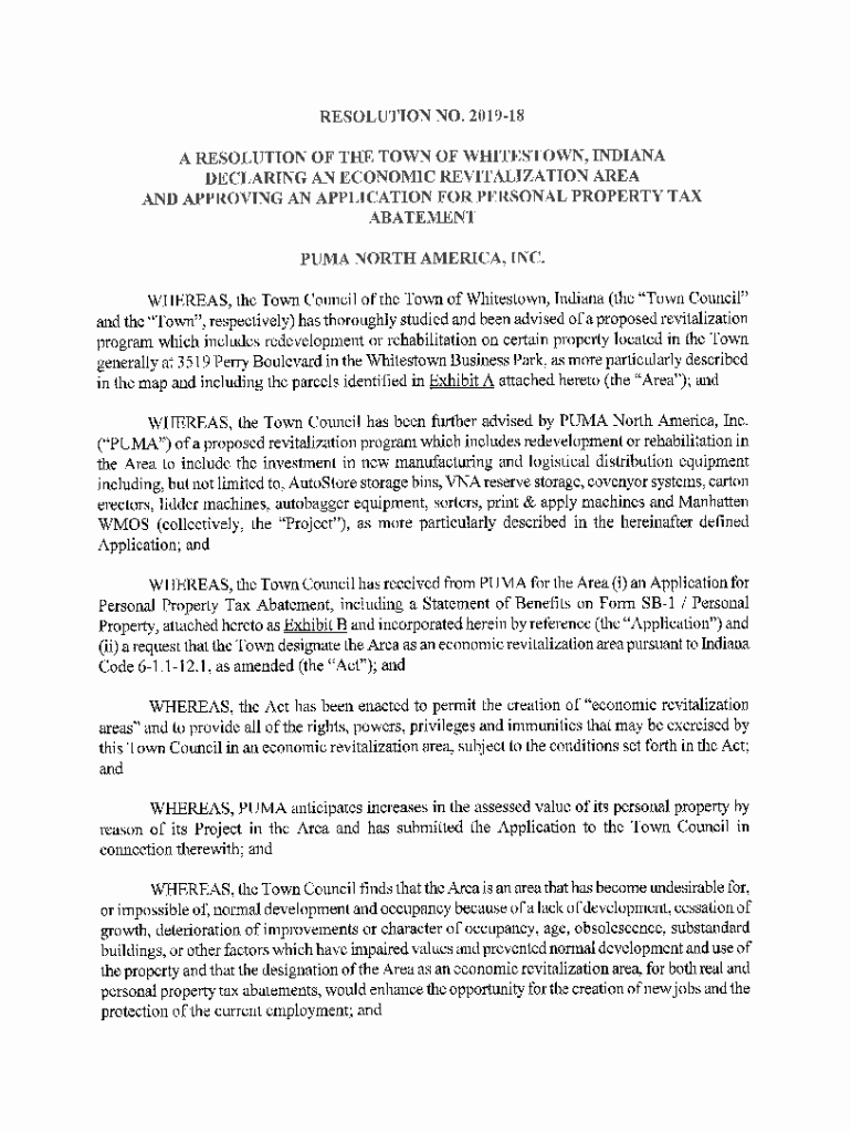 RESOLUTION NO.201918 A RESOLUTION OF THE TOWN OF WATERTOWN, INDIANA DECLARING AN ECONOMIC REVITALIZATION AREA AND APPROVING AN APPLICATION FOR PERSONAL PROPERTY TAX ABATEMENT PUMA NORTH AMERICA, INC.