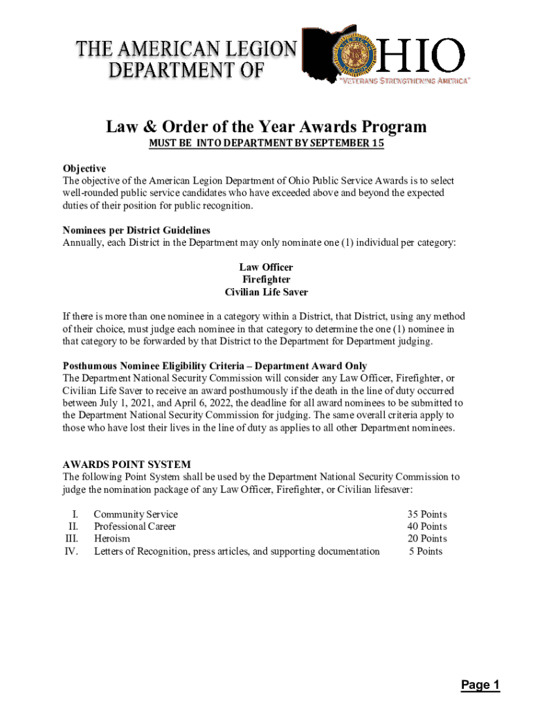 Law & Order of the Year Awards Program MUST BE INTO DEPARTMENT BY SEPTEMBER 15Objective The objective of the American Legion Department of Ohio Public Service Awards is to select well-rounded public